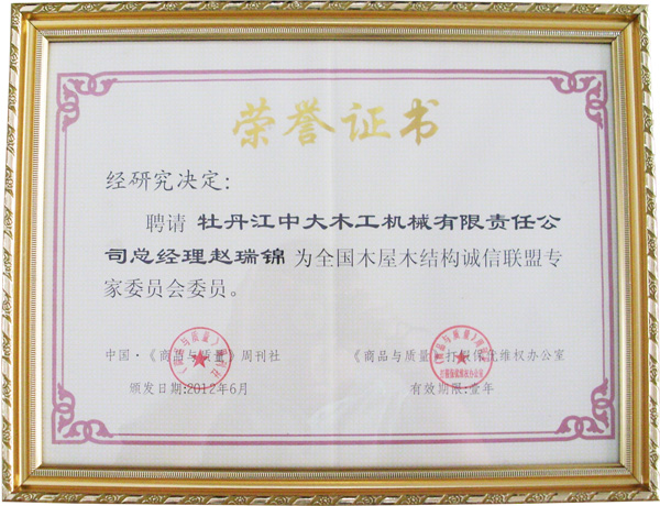 荣誉证书-全国木屋木结构诚信联盟委员会委员